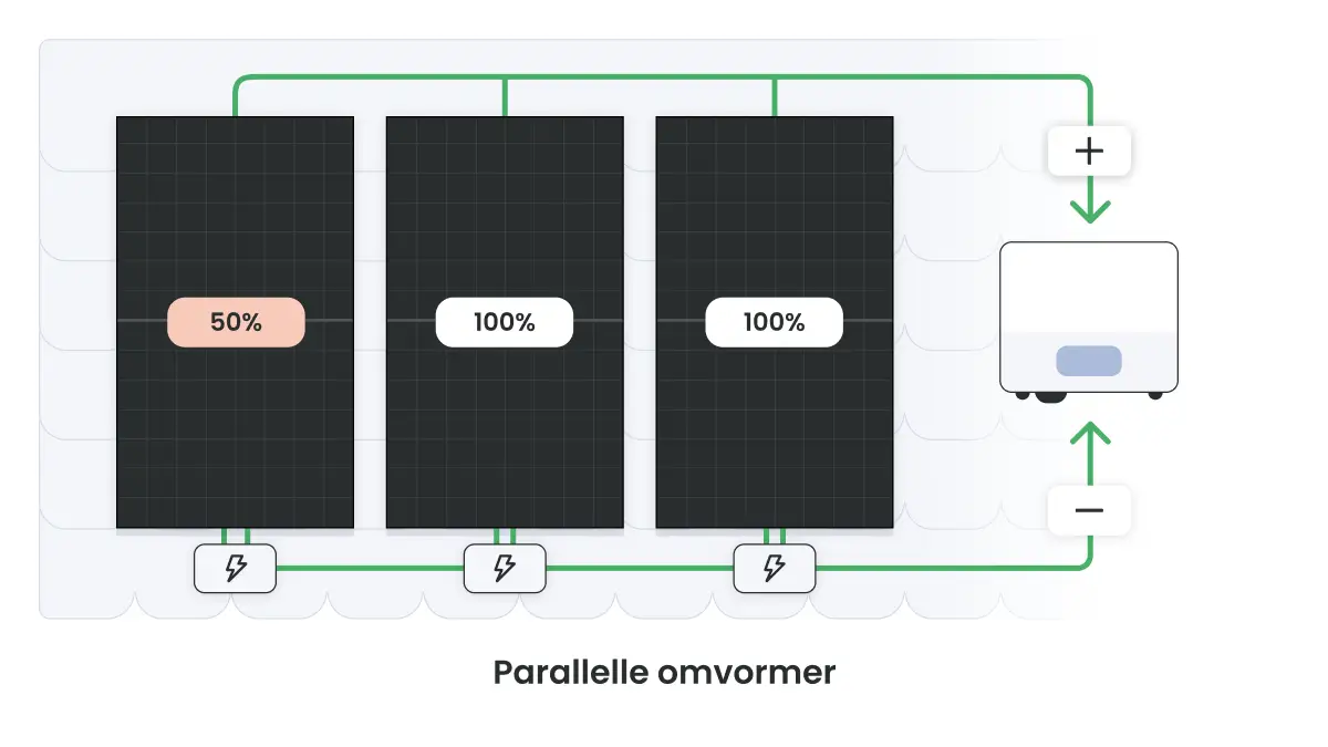 Een parallelle omvormer combineert het beste van twee werelden. Net als bij een seriegeschakelde omvormer heb je één centrale omvormer in huis, maar elk zonnepaneel krijgt ook een optimizer. Dit zorgt ervoor dat de panelen onafhankelijk van elkaar werken, net als bij micro-omvormers. Heeft één paneel last van schaduw? Dan blijven de andere panelen gewoon maximaal presteren.